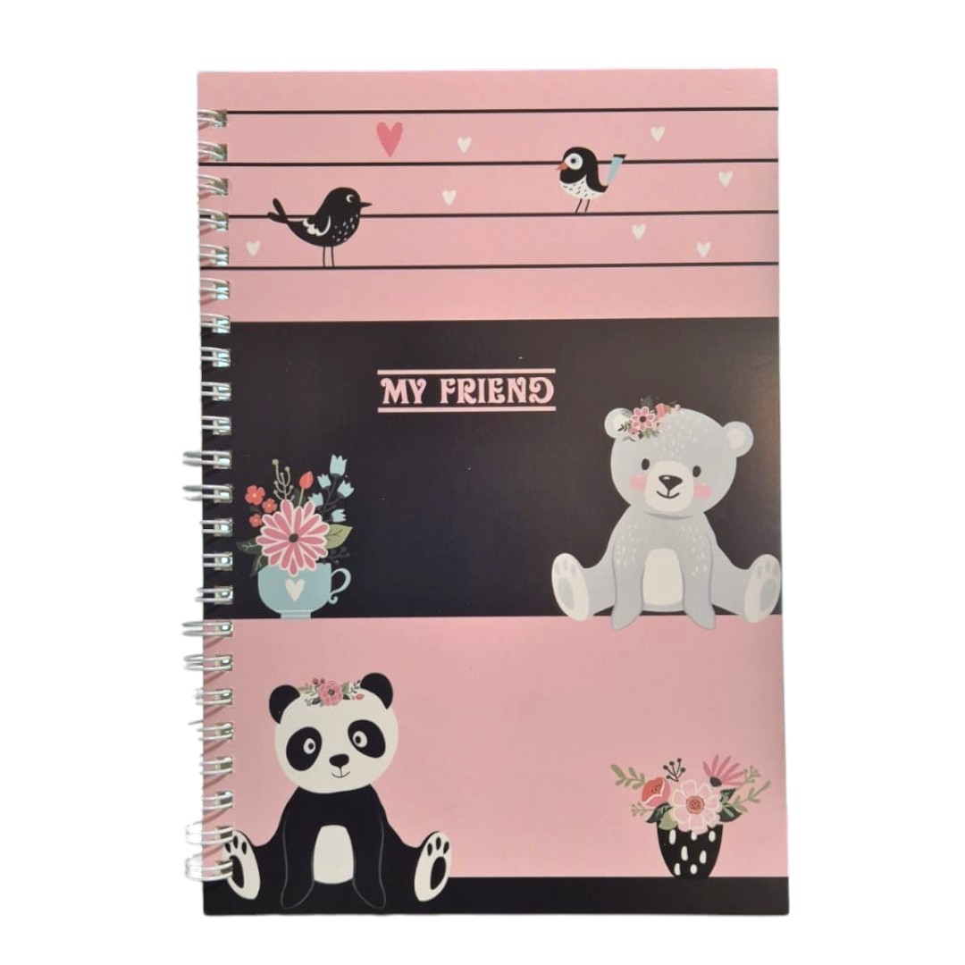Caderno espiral com design fofo de panda e urso, ideal para anotações do dia a dia com estilo e praticidade. Possui formato A5, compacto e fácil de transportar na bolsa ou mochila.