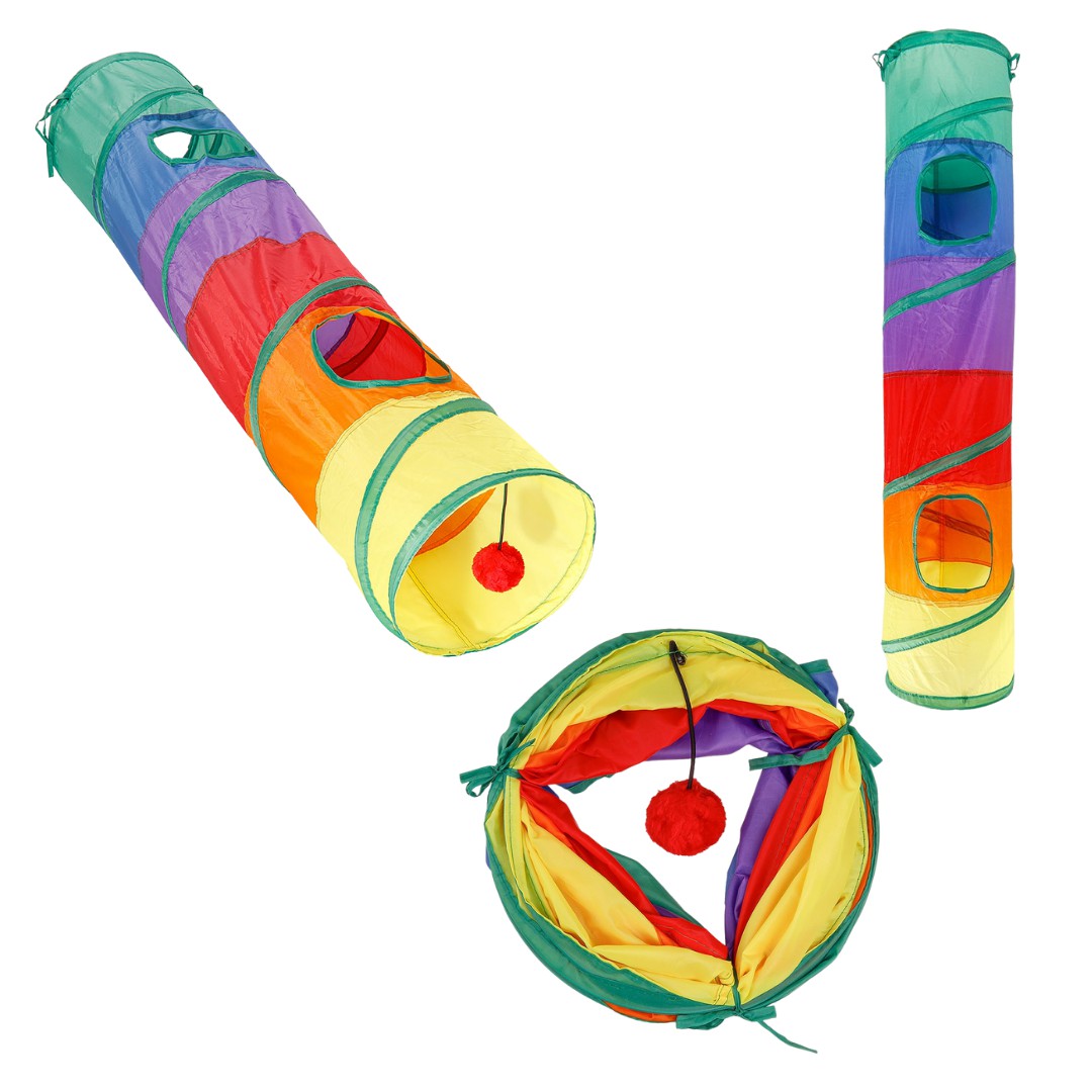 Deixe o dia do seu gatinho mais divertido com esse túnel cheio de cor e aventura! 🌈🐈