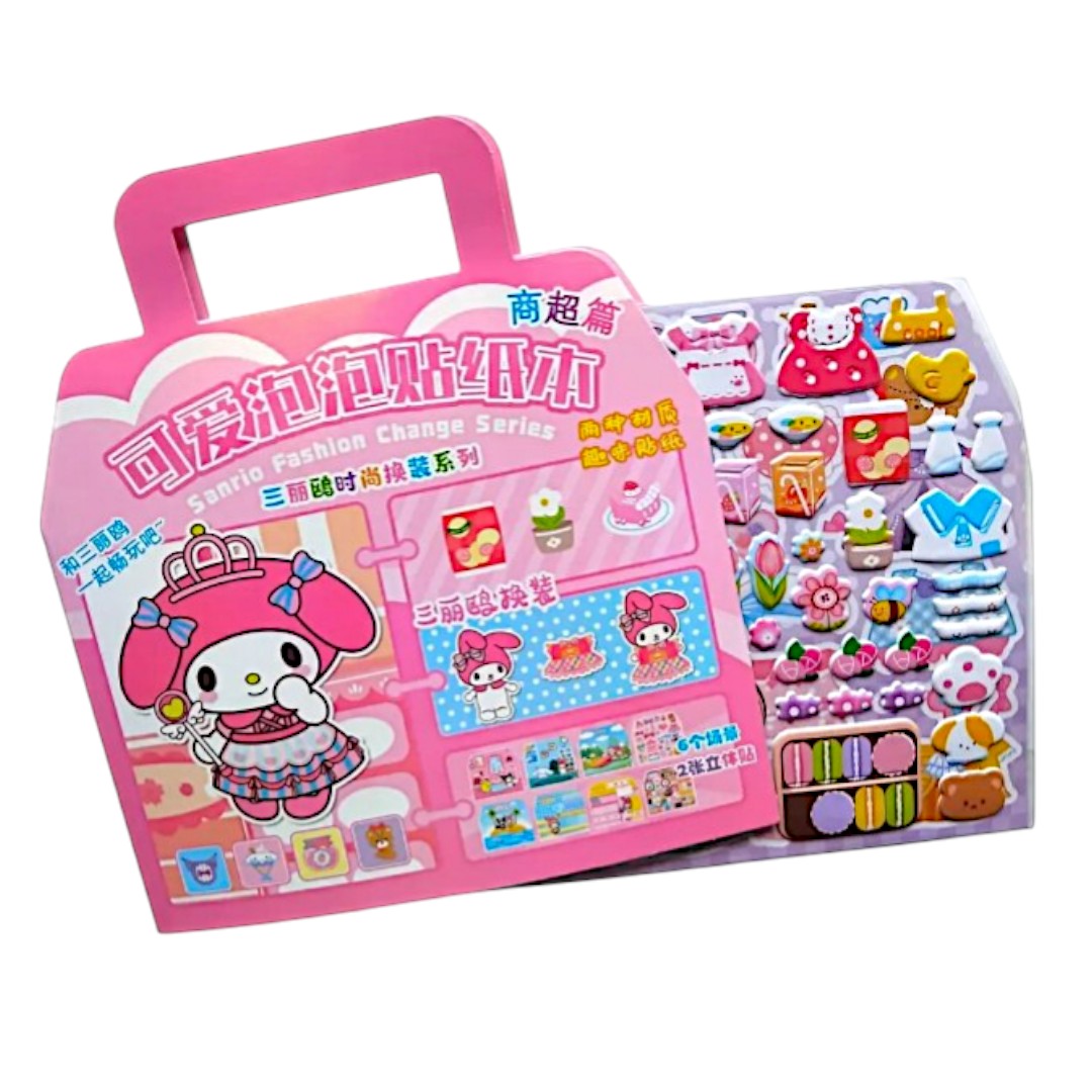O kit permite montar roupinhas, cenários, móveis e até comidinhas utilizando as cartelas de adesivos inclusas. Disponível com personagens como My Melody, Kuromi e Cinnamoroll, é perfeito para colecionar, brincar e desenvolver habilidades criativas. Ideal para uso em casa, viagens ou como presente especial.